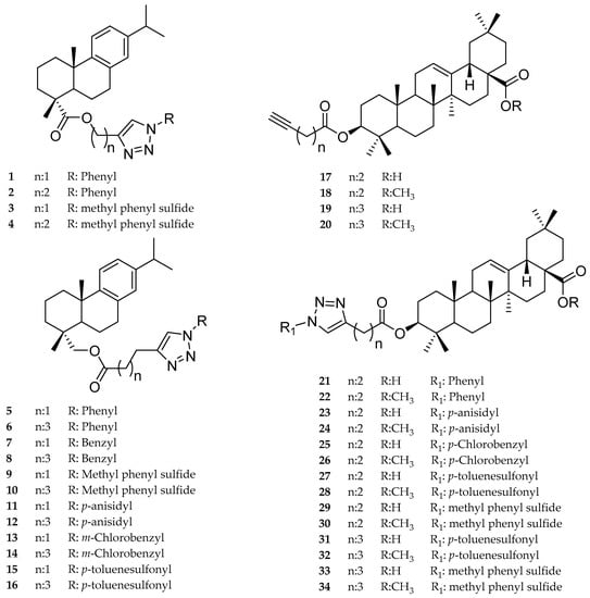 Dehydroabietic acid (DHA) was obtained from commercial rosin as described in [41]. Oleanolic acid (OA) was isolated from the aerial parts of Fabiana imbricata [42]. The triazole derivatives were prepared as described previously (Figure 1) [41,42]. Briefly, DHA was methylated with CH2N2 to afford dehydroabietic acid methyl ester. Reduction of the methyl ester with LiAlH4 in THF gave the corresponding alcohol (dehydroabietinol). Starting from DHA and its alcohol, 16 abietane-triazole compounds were obtained using click chemistry [41]. The alkyl esters of DHA and its alcohol were prepared using N,N-dicyclohexylcarbodiimide (DCC)/ dimethylaminopyridine (DMAP) and appropriate alcohol or acid with alkyl function. The alkynyl esters were treated with different azides in t-BuOH/H2O using CuSO4.5H2O and sodium ascorbate to obtain the derivatives 1–16 (Figure 1).