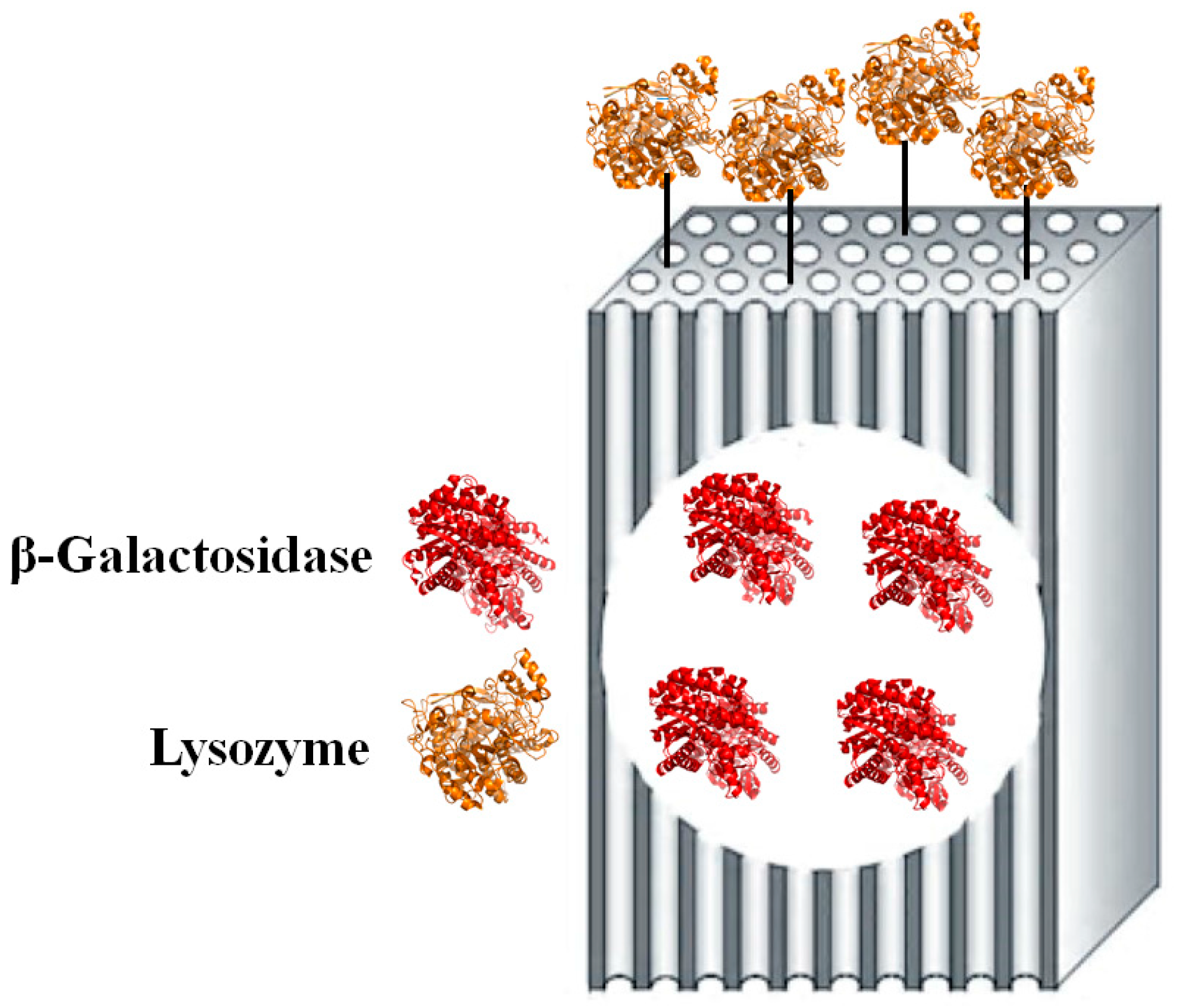 In industrial applications, β-galactosidase is used to convert lactose to glucose and galactose, producing low lactose milk for individuals suffering from lactose intolerance [1]. However, the cost of β-galactosidase and its sensitivity to environmental changes have limited its utilisation [2]. Immobilisation techniques have been shown to enable easier separation of enzymes from reaction media to facilitate enzyme reuse, while also enhancing enzyme performance by improving enzyme stability, activity, specificity, and selectivity and reducing inhibition [3,4,5,6,7]. For instance, the stabilisation of monomeric enzymes can be improved by multipoint covalent attachment or generation of favourable environments surrounding enzymes [8], while the stabilisation of multimeric enzymes can be boosted by multi-subunit covalent immobilisation to avoid subunit dissociation [9]. Moreover, immobilisation may improve enzyme activity through inhibition of aggregation, while concurrently bolstering enzyme structure to preserve enzymatic activity, even under drastic conditions [10]. When inhibition of enzyme activity results from a high concentration of substrate, product, or other components in the reaction medium, such inhibition may be diminished by deliberate conformational distortion of enzymes through the use of immobilisation strategies [10,11,12]. Furthermore, the specificity and selectivity of immobilised enzymes can be markedly elevated through rational distortion of their active sites, induction of enzyme conformational changes, or by altering the interaction between an enzyme and its carrier substrate [7,10,11,13]. In our previous work, β-galactosidase was successfully incorporated into a silica matrix using a “fish-in-net” encapsulation approach and molecular imprinting technique; the encapsulated β-galactosidase exhibited an increase in specific activity of 145% compared with free enzyme [14]. Unfortunately, β-galactosidase incorporated within a silica matrix is vulnerable to bacterial contamination during continuous production of low lactose milk [15], and this issue must be addressed.