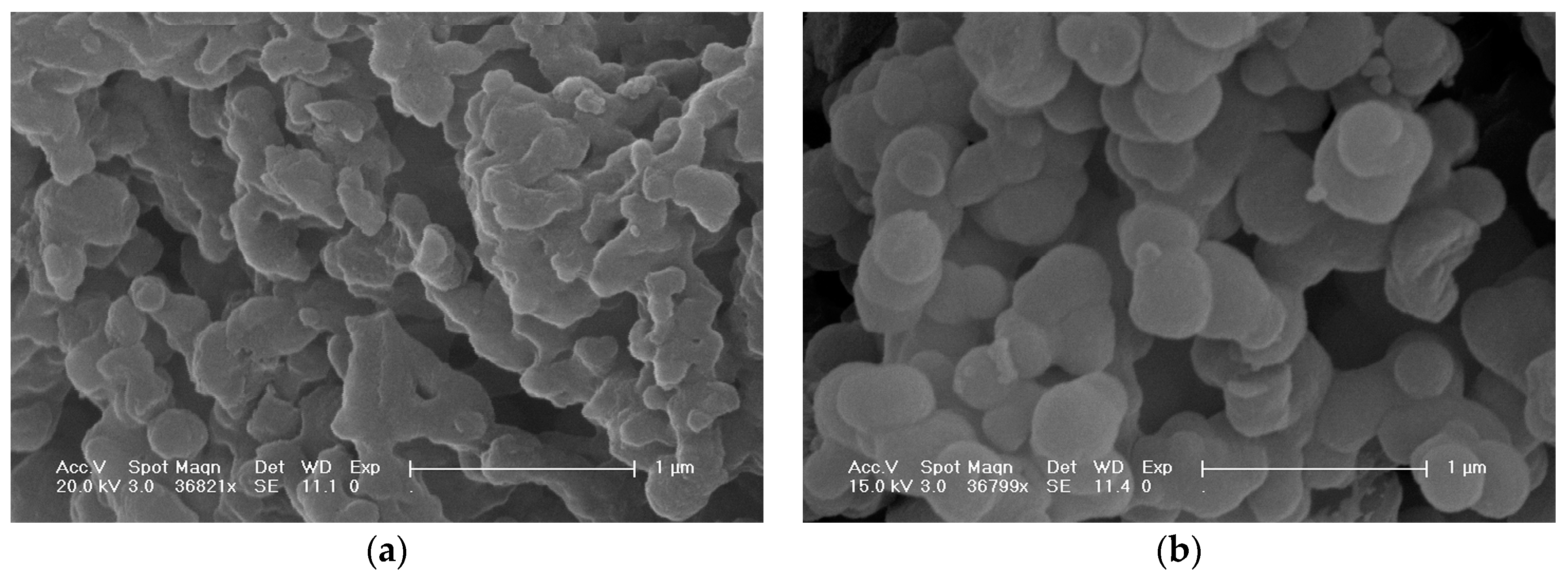 Transmission electron microscopy was performed using an FEI Tecnai G2 F20 S-twin (FEI, American, Hillsboro, OR, USA) at 200 kV. Powder X-ray diffraction (PXRD) data were collected on a Rigaku D/Max 2550 diffractometer (Rigaku Co., Tokyo, Japan) with Cu Kα radiation (λ = 1.5418 Å) over the 2θ range of 4°–40° at room temperature. SEM experiments were performed using a JSM-6700F field emission scanning electron microscope (JEOL, Tokyo, Japan) with an acceleration voltage of 150 kV [44]. FTIR spectra were surveyed using a Nicolet 5700 FTIR spectrometer (Thermo Fisher Scientific, Inc., Waltham, MA, USA) with a resolution of 4 cm−1 using the KBr method.