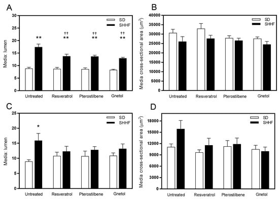 Stilbenoid effects on vascular geometry. Media-to-lumen ratio in (a) mesenteric resistance arteries and (c) middle cerebral arteries were increased in untreated SHHF rats, and this was attenuated by 8-week treatment with resveratrol, pterostilbene, and gnetol (2.5 mg/kg/day). In contrast, no significant differences in media CSA (b,d) were detected. n = 4–8. * p < 0.05 and ** p < 0.01 vs. untreated SD. †† p < 0.01 vs. untreated SHHF.