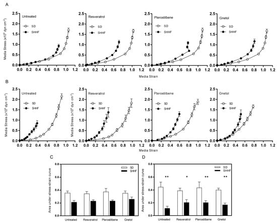 Vascular compliance is measured by plotting the relationship between media stress and media strain. Leftward shifts of the stress-strain curve were observed in mesenteric resistance (Figure 2A) and middle cerebral (Figure 2B) arteries from untreated SHHF rats, and this was quantified as decreases in the areas under the curve (AUC) that approached (mesenteric arteries; p = 0.07) or achieved statistical significance (cerebral arteries; p < 0.01; Figure 2C,D, respectively). Stilbenoid treatment failed to improve compliance in SHHF cerebral arteries.