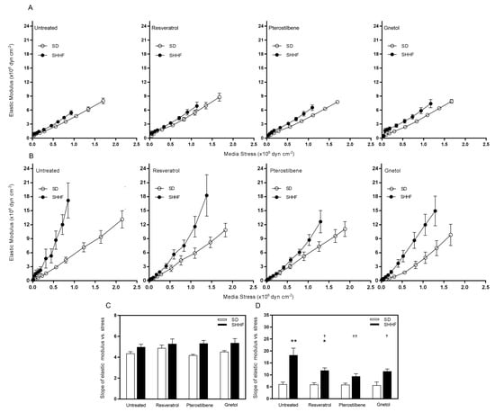 Vascular geometry is mathematically eliminated as a determinant of vascular wall stiffness when elastic modulus (EM) is plotted against media stress; therefore, the slope of the EM vs. stress curve provides information pertaining to the stiffness of wall components (such as elastin, collagen, and smooth muscle cells). Although wall component stiffness was similar between SD and SHHF mesenteric arteries (Table 1; Figure 3A,C), it was significantly increased in SHHF middle cerebral arteries (Table 1; Figure 3B,D; p < 0.01). Resveratrol, pterostilbene, and gnetol reduced wall component stiffness toward normal (Table 1; Figure 3B,D).