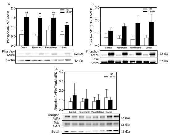 Arterial AMPKα activation status: effect of stilbenoid treatment. Activation of AMPKα vis-à-vis phosphorylation at Thr172 in (A) mesenteric arteries from SHHF rats compared to SD arteries is likely due in part to (B) a trend where total AMPK levels are increased in untreated and resveratrol- or pterostilbene-treated SHHF rats (since statistical significant changes are obscured by normalization with total AMPK). Only in the presence of gnetol (A) was there a lack of statistically-significant AMPKα phosphorylation in SHHF mesenteric arteries. (C) No significant differences in AMPK were detected in cerebral arteries. n = 3–4. ** p < 0.01 vs. SD-C.
