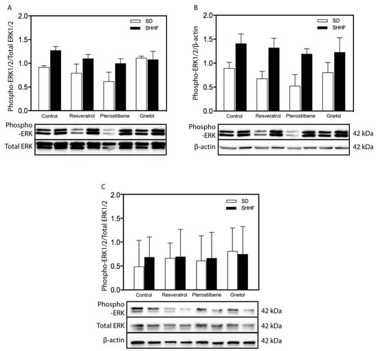 Arterial ERK activation status: effect of stilbenoid treatment. ERK activity was similar in mesenteric arteries whether normalized by (A) total ERK; or (B) β-actin; and (C) cerebral arteries from SHHF rats compared to SD arteries, whether in the presence or absence of stilbenoid treatment. n = 3–4.
