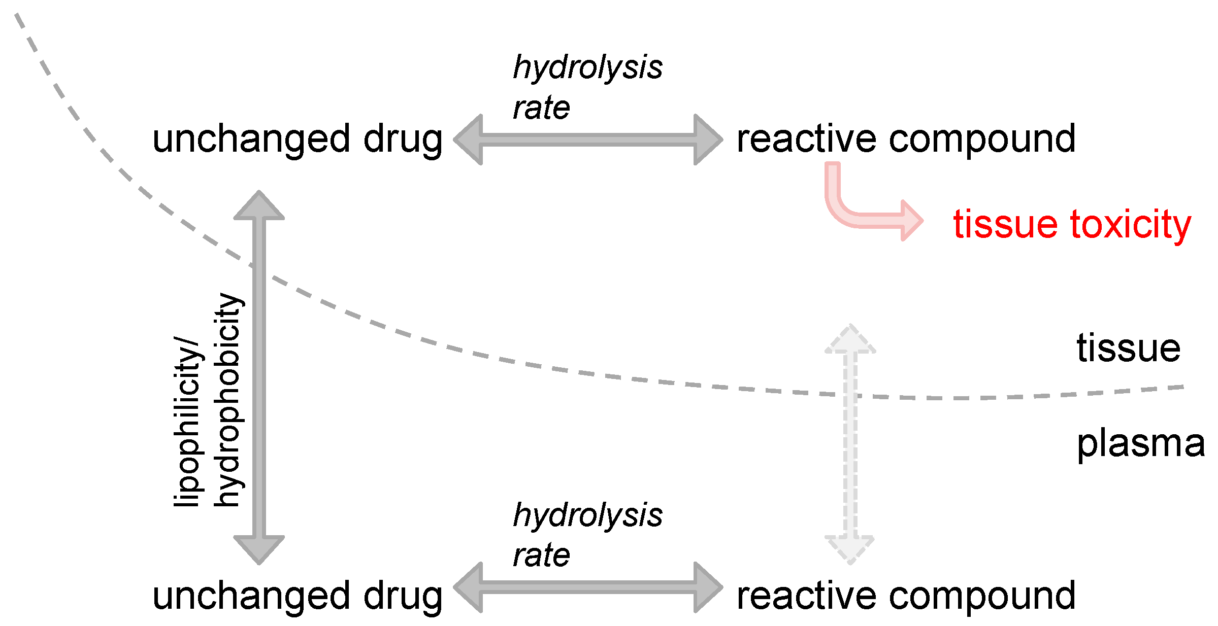 Impact of hydrolysis rate (aquation reaction kinetics) on tissue distribution and toxicity. Tissue distribution of unchanged platinum drug is mainly determined by the lipophilicity or hydrophobicity of its carrier and leaving group, respectively. After substitution with water, the positively charged reactive compound present in plasma (and potentially bound to plasma proteins) can hardly penetrate tissue barriers. In contrast, reactive compounds present in the tissue will lead to toxicity.