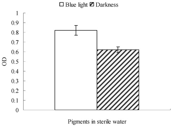 Results described in Section 2.1 and Section 2.2 indicate that blue light could affect Monascus physiological activities. Mycelium membrane permeability is an important physiological activity, so it is very necessary to discuss the effect of blue light on Monascus mycelium permeability. The effect of blue light on Monascus resting membrane permeability, performed as described in Section 3.4, is shown in Figure 3. Figure 3 shows the absorbance at 510 nm of sterile water in blue light was 0.82, which was significantly higher than the absorbance of 0.62 obtained from sterile water in darkness. This showed that Monascus pigment content in sterile water was higher under blue light. The Monascus pigments in sterile water could only be derived from the pellicle since nutrient was almost entirely absent in sterile water, which prevented any Monascus growth. Our results suggested that blue light enhances release of Monascus pigments from pellicles to the surrounding environment. In addition, mycelium cell permeability of Monascus was also improved by exposure to blue light.