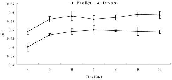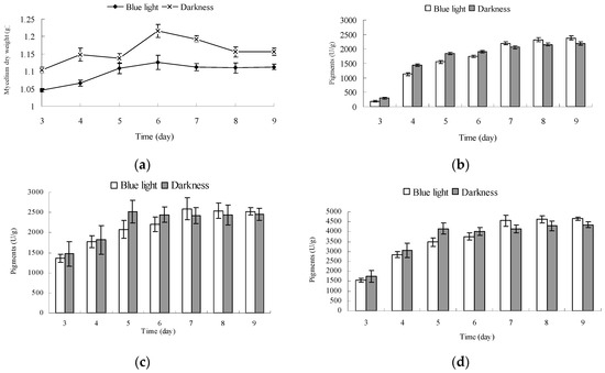 The mycelium dry weight of Monascus cultured for 6 days under blue light and in darkness reached a maximum value of 1.126 g and 1.216 g, respectively (Figure 5a). The mycelium dry weight of Monascus cultured under blue light was fairly stable after 6 days, however, that of Monascus cultured in darkness decreased noticeably. The mycelium dry weight of Monascus cultured under blue light was lower than that of those cultured in darkness throughout the entire culture process. This could be attributed to the fact that blue light is not conducive to the growth of Monascus, which is consistent with the results of Chen [21]. In the early stage of fermentation (3–6 day), the pigment contents in fermentation broth and mycelium under blue light were less than those in darkness (Figure 5b–d). This could be explained by blue light leading to a certain amount of degradation of Monascus pigments, as shown in Figure 6. In this early stage, synthesis of Monascus pigments is less substantial, therefore, any decomposition caused by blue light would be more obvious. When mycelium weight reached the maximum on day 6, pigments in fermentation broth under blue light increased significantly. The pigment contents of Monascus in fermentation broth grown under blue light for on days 6 and 7 were, respectively, 1741 U/g and 2194 U/g. The increase in pigment content in fermentation broth in darkness was not as noticeable as that exposed to blue light. The pigment yields of Monascus in fermentation broth grown in darkness on days and 7 were, respectively, 1900 U/g and 2060 U/g. After 6 days, Monascus pigment yield in mycelium cultured under blue light continued to increase; however, the pigment content in mycelium cultured in darkness remained fairly unchanged. The pigment contents in Monascus mycelium incubated under blue light and darkness for 7 days were 2593 U/g and 2417 U/g, respectively. Results in Section 2.4 showed that chitin content of mycelium wall of Monascus cultured under blue light was less than that in darkness, which would influence the permeability of Monascus mycelium cell, enhancing Monascus pigment secretion from aerial hyphae to culture medium. Therefore, it is likely that pigments within the mycelium cultured under blue light were more easily transported from the inside to the outside of the mycelium than those cultured in darkness. This would also explain the noticeable increase in pigment content of fermentation broth cultured under blue light after 6 days. Due to the decrease in feedback inhibition of Monascus pigment synthesis under blue light, pigment production in mycelium continued to increase, and pigment yield per unit mycelium weight was higher than that cultured in darkness. The total pigment yields produced by a unit mycelium weight cultured under blue light and in darkness after 9 days were, respectively, 4663 U/g and 4352 U/g.