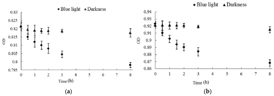 Effect of blue light on the stability of Monascus pigments in fermentation broth and mycelium. (a) The stability of Monascus pigments in fermentation broth; (b) the stability of Monascus pigments in hyphae. Monascus pigments in fermentation broth and mycelium ethanol extraction were randomly assigned to two groups of three samples. One group was exposed to blue light while the other group was kept in darkness. Absorbance at 510 nm of pigments’ solution was determined every 20 min, and the average absorbance of three samples was calculated.