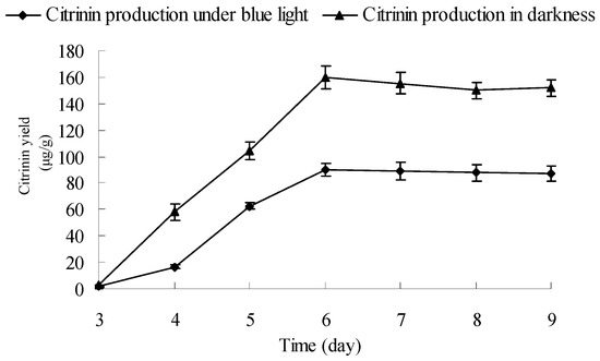To investigate the influence of blue light on Monascus citrinin yield, the citrinin yields of Monascus cultured by liquid-state fermentation under blue light and in darkness were dynamically measured. Results are shown in Figure 7. Figure 7 shows that citrinin yields of Monascus cultured by liquid-state fermentation under blue light and darkness simultaneously reached maximum levels of 90 μg/g and 160 μg/g, respectively. In the course of cultivation (3–9 days), the citrinin yield under blue light was lower than in darkness. At the end of fermentation (9 days), the citrinin yields of Monascus under blue light and darkness were, respectively, 88 μg/g and 150 μg/g. During the entire liquid-state fermentation process, the weight of Monascus mycelium under the blue-light culture condition was lower than that in darkness; however, the difference in mycelium weight was not the ultimate reason that led to a 50% decrease of final citrinin yields between Monascus cultured under the two conditions. In fact, the degradation of citrinin caused by blue light in fermentation broth could be one attributing factor. In addition, Monascus contains light photoreceptors that allow for blue light inductive signaling, which, in turn, leads to changes of Monascus intracellular metabolic pathways that ultimately affect the synthesis of enzymes that degrade citrinin or inhibit the synthesis of citrinin in Monascus. In order to investigate the mechanism that contributes to the decrease in citrinin content under blue light irradiation during Monascus liquid-state fermentation, we performed the following experiments.