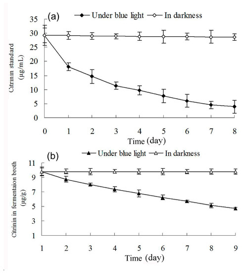 Effects of blue light on the stabilities of citrinin standard (a) and citrinin in fermentation broth (b). Citrinin standard methanol solution and citrinin of Monascus fermentation ethanol extraction were respectively exposed to blue light and kept in darkness. Citrinin content was determined by HPLC at specific time intervals.