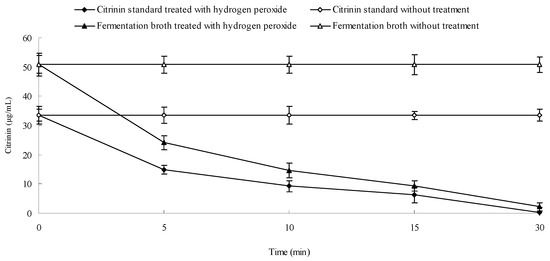 To determine the effects of hydrogen peroxide on citrinin stability, 0.05 mL of 30% hydrogen peroxide solution was respectively added to 3.6 mL citrinin standard methanol solution and citrinin extraction solution of Monascus fermentation broth. Citrinin content was determined by HPLC, as described in Section 3.8.2, at regular time intervals.