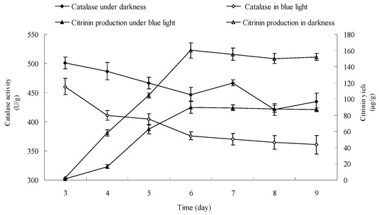 Catalase activity in Monascus mycelium was dynamically examined from day 3 to day 9 according to the method described in Section 3.13. Results are shown in Figure 10. Figure 10 shows that the catalase activities in Monascus mycelium were 460.45 U/g and 501 U/g, respectively, in early fermentation (day 3) under blue light and in darkness. The corresponding citrinin yields were 1.5 μg/g and 2.73 μg/g, respectively. The catalase activities were 361 U/g and 434 U/g and the corresponding citrinin yields were 88 μg/g and 152 μg/g at the end of fermentation (day 9). The catalase activity in Monascus mycelium and the citrinin yield under blue light were both lower than those in darkness throughout the entire fermentation process. Figure 9 showed that H2O2 had a strong effect on degradation of citrinin. H2O2 content is closely linked to the activity of catalase. Catalase catalyzes the transformation of H2O2 into nontoxic water and oxygen, therefore, the level of catalase activity directly predicts the amount of H2O2 within Monascus mycelium. Catalase activity in Monascus mycelium under blue light was lower than that in darkness, which could result in an increase of H2O2 accumulation, which is consistent with a previous report [26]. The presence of H2O2 might have a destructive effect on citrinin, which would explain the lower citrinin content under blue light than that in darkness.