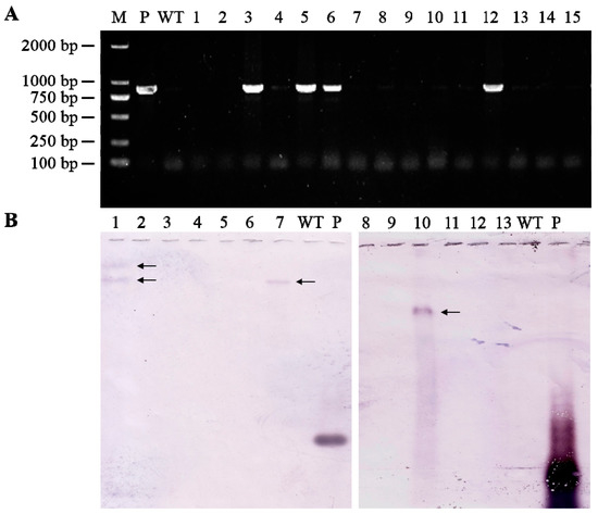 Analyses of wheat lines transformed with pWM101-EU586278 using PCR and southern blot methods. (A) PCR analysis of genomic DNA with Hyg gene. M, DL2000 marker; P, plasmid pWM101-EU586278 (positive control); WT, the untransformed wild plant (negative control); lines 1–15, wheat plants transformed with pWM101-EU586278; (B) Southern blot. Lines 1–13, thirteen randomly selected PCR positive lines; WT, the untransformed wild plant (negative control); P, the purified probe product (positive control).