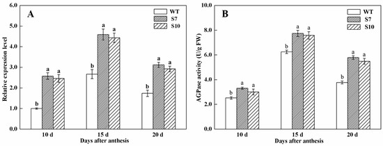 Transcript levels of TaAGPS1b-EU586278 (A) and AGPase activities (B) in endosperm of the developing grains of WT and transgenic wheat lines. Notes: (1) Transcript levels at 10, 15 and 20 days after anthesis were measured by qPCR using β-actin gene as internal control. (2) WT, the untransformed wild plant; S7 and S10, the two independent TaAGPS1b-EU586278 T3 transgenic wheat lines. (3) Each value is the mean ± SD of three independent biological replicates. Different letters represented statistical significance at p < 0.05.