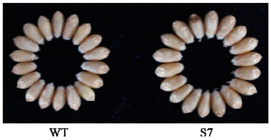 Comparison of phenotype of mature grains between WT and the representative transgenic wheat lines. Eighteen grains were randomly selected in WT and S7 line, respectively.