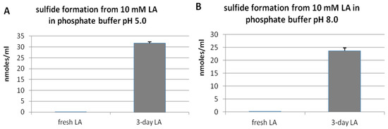 Figure 2 presents non-enzymatic sulfane sulfur formation from LA under in vitro conditions. The fresh LA contained trace amounts of sulfane sulfur; however, after three days, significant amounts of sulfane sulfur were detected in the samples non-protected from light. A slightly higher level of sulfane sulfur was estimated at pH 8.0 (Figure 2A,B). It suggests that sulfane sulfur is formed from LA non-enzymatically in the presence of light.