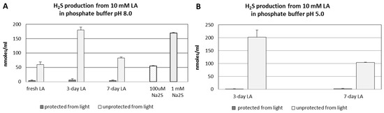 Level of hydrogen sulfide formed in vitro from fresh lipoic acid (LA) or from LA left for three days unprotected from light at pH 5.0 (A) or 8.0 (B). The results are presented as the means ± SD (standard deviation).
