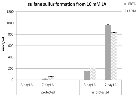 When samples were protected from light independently of the presence of EDTA, no or only a trace amount of sulfane sulfur was detected after three or seven days, respectively. A significant amount of sulfane sulfur was detected only in samples non-protected from light, especially after seven days. After three days, the level of sulfane sulfur in the samples left unprotected from light was much smaller than after seven days but visibly higher than in samples protected from light. EDTA in three-day LA samples raised subtly the amount of sulfane sulfur, but, in seven-day LA samples, the level of sulfane sulfur was a slightly decreased in EDTA samples (Figure 4). The presence of EDTA had no clear effect on the level of sulfane sulfur.