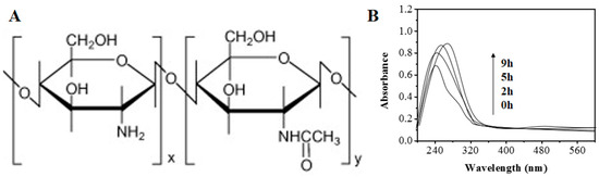 (A) Chemical structure of chitosan (CS); (B) UV-vis absorption spectra of the reduced graphene oxide (RGO) recorded at various times.