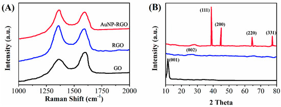 Raman scattering is an effective instrument with high sensitivity for the characterization of carbon-based materials. The Raman spectra of GO, RGO, and RGO/AuNP is shown in Figure 2A. For GO, two feature bands at 1308 cm−1 (D band) and 1601 cm−1 (G band) were observed in the spectrum of GO, which are ascribed to the sp3 and sp2 carbon hybridization, respectively [36]. Compared with GO, the ID/IG ratio of RGO (1.34) is significantly higher after electrodeposition, which suggests that the mean size of the sp2 sites increases. According to the references, the reduction has been considered to take place [37,38]. Except for a small upshift in the G-band (from 1601 to 1604 cm−1), a similar scattering profile was observed in the spectrum of RGO/AuNP with RGO, which is caused by the doping of Au nanoparticles on the RGO sheets [39,40].