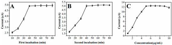 Effect of peak current on the incubation time of (A) the first incubation step and (B) the second incubation step with 100 ng/mL NSE; (C) incubation concentration of anti-NSE, when changing one parameter and keeping the others at the best conditions. The standard deviations—calculated from three different tests—are described by the error bars.