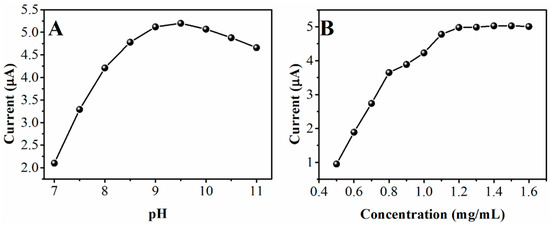 Moreover, the pH of the substrate solution was an essential factor in the enzyme-catalyzed reaction. As shown in Figure 4A, a maximum response was observed at pH 9.5, where the investigation was performed in the pH range of 7.0 to 11. Hence, a pH of 9.5 was considered to be the optimum value of pH due to the highest activity of AP. Here, the concentration of α-NP in the measurement influenced the behavior of the electrochemical analysis. In Figure 4B, the DPV peak current of the immunosensor in diethanolamine (DEA) increased when the concentration of α-NP increased to 1.6 from 0.5 mg/mL and then reached a plateau when the concentrations were higher. Moreover, the content of the AP-anti-IgG/AuNP-RGO bound on the immunosensor determined the enzymatic reaction rate. Hence, 1.2 mg/mL was fixed as the optimal α-NP concentration to detect AuNP-RGO-amplified DPV.