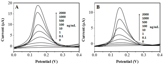 Representative differential pulse voltammetric (DPV) curves of the AP-anti-IgG/AuNP-RGO/anti-NSE/NSE/GCE (A) and the alkaline phosphatase (AP)-anti-IgG/anti-NSE/NSE /GCE (B) obtained with NSE in a concentration of 0, 0.1, 1, 10, 100, 500, 1000, and 2000 ng/mL.