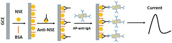 The function of the immunosensor is dependent on the antibodies, which can react with the corresponding antigens and the quantification is normally completed by measurements of the particular activity of the label, such as bioluminescence [10], fluorescence [11], enzyme or chemical amplification [10], radioactivity [12], electrochemical response [13,14], surface plasmon resonance [15], and the influence on the quartz crystal microbalance [16]. According to the immunobioluminescent tests [17,18], mass spectrometry [19], and two-dimensional (2D) differential in-gel electrophoresis [20], several approaches to the detection of NSE have been reported. However, complicated instrumentation and sophisticated and time-consuming pretreatment of sample are generally necessary in these methods. Consequently, electrochemical immunosensors have become a promising analytical method to detect antibody and antigen in the past decades, because of their high sensitivity, relatively low-cost, and quick analysis time [21,22,23]. Recently, nanoparticle-based electrochemical immunosensors have attracted intensive attention with the development of nanotechnology, due to their special electrical, optical, catalytic, and thermal properties [24,25,26].