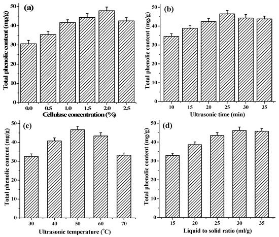 With UAEE, the enzyme degradation and destruction of the cell-wall matrix have been considered as a primary step to enhance the release of phenolic compounds, keep their stability and antioxidant activities [29]. In this study, with other extraction conditions fixed at ultrasonic time 20 min, ultrasonic temperature 50 °C and liquid to solid ratio 30 mL/g, the effect of cellulase concentrations at different levels (from 0% to 2.5%) on extraction of TPC was studied. As shown in Figure 1a, there was a notable increasing in TPC with increasing cellulase concentrations from 0% to 2.0%, beyond which the TPC value began to decrease. Similar findings were reported for flavonoid extraction from Illicium verum residues [30]. This result indicated that 2.0% cellulase could completely hydrolyze the cell walls of T. quadrispinosa stems to release the intracellular phenolic compounds. However, the viscous cellulase solution with high concentrations was not avail to the hydrolysis reaction process [30]. Therefore, 2.0% cellulase was considered the optimal enzyme concentration in further experiments.