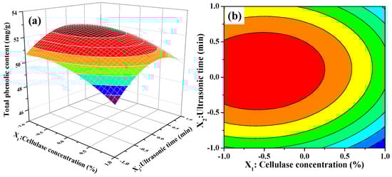 The experimental and predicted values of TPC are listed in Table 1. Among the 15 experiments including three replicates, the TPC values ranged from 44.6 mg·GAE/g·DW to 52.7 mg·GAE/g·DW, and experiment 13 (cellulase concentration 2.0%, ultrasonic time 25 min and ultrasonic temperature 50 °C) has the greatest TPC (52.7 mg·GAE/g·DW) and experiment 8 (cellulase concentration 2.5%, ultrasonic time 25 min and ultrasonic temperature 60 °C) has the smallest (44.6 mg·GAE/g·DW).
