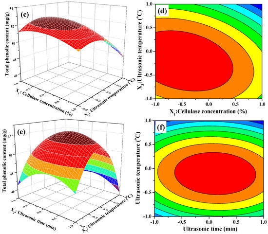 Contour (a,c,e); and response surface (b,d,f) plots for interactions between three independent extraction parameters on the extraction yields of phenolic extracts (X1: Cellulase Concentration; X2: Ultrasonic Time; and X3: Ultrasonic Temperature).