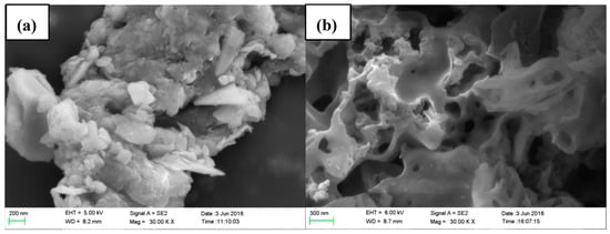 Scanning electron microscopic images of residues in the extraction of T. quadrispinosa stems: (a) untreated; and (b) treated by UAEE.
