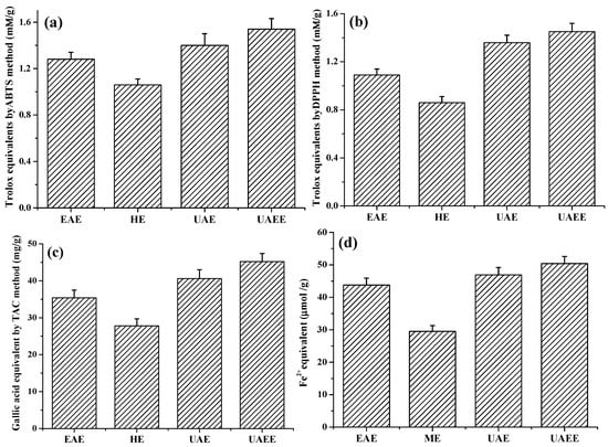 Four methods, ABTS, DPPH TAC and FRAC, were chosen to determine the antioxidant capacity of extracts obtained from different extraction methods. The results are shown in Figure 4. As shown in Figure 4, all of the four values exhibited the similar behaviors: UAEE yielded the highest antioxidant activities of 1.54 ± 0.09 mmol·TE/g·DW, 1.45 ± 0.07 mmol·TE/g·DW, 45.2 ± 2.2 mg·GAE/g·DW and 50.4 ± 2.6 μmol FeSO4 equivalent/g·DW by ABTS, DPPH, TAC, and FRAP methods respectively. Conversely, HE method yielded the lowest antioxidant activities of 1.28 ± 0.06 mmol·TE/g·DW, 1.09 ± 0.05 mmol·TE/g·DW, 27.8 ± 1.9 mg·GAE/g·DW and 29.5 ± 1.8 μmol FeSO4 equivalent/g·DW, respectively.