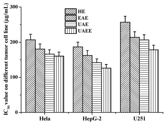 Antitumor activities (IC50 μg/mL) of phenolic extracts obtained from different extraction methods on the Hela, HepG-2 and U251 cells.