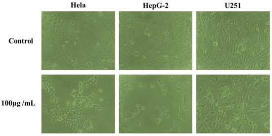 The effects of phenolic extracts obtained from different methods on the growth of Hela, HepG-2 and U251cells were investigated using the MTT assay. The results of growth inhibitory effects of different phenolic extracts, with IC50 values, are shown in Figure 5, which very clearly indicates all phenolic extracts exhibited high growth inhibitory effects on cell viability of Hela, HepG-2 and U251 cells. Among them, the phenolic extracts obtained from UAEE had greatest inhibitory effect on the growth of cells compared to other methods with the lowest IC50 values of 160.4 ± 11.6 μg/mL, 126.1 ± 10.8 μg/mL, 178.3 ± 13.1 μg/mL against Hela, HepG-2 and U251 tumor cells, respectively. However, phenolic extracts obtained from HE had weakest inhibitory effect on the growth of cells with the highest IC50 values of 206.8 ± 15.6 μg/mL, 186.5 ± 13.5 μg/mL, and 256.9 ± 16.9 μg/mL against Hela, HepG-2 and U251 tumor cells, respectively. To further confirm the proliferation inhibitory effects on Hela, HepG-2 and U251 cells, the morphology changes induced by phenolic extracts (100 μg/mL) obtained from UAEE were investigated. As illustrated in Figure 6, the morphology of the control untreated cell was regular and intact, whereas cells treated with phenolic extracts exhibited obvious signs of growth inhibition, including decreased cell number, diminished cell volume, and increased cell shrinkage. At the same time, some cells gathered together and dead cells or apoptotic cells appeared. This revealed that phenolic extracts of T. quadrispinosa stems could affect cell proliferation and survival which was consistent with the cell viability assay results.