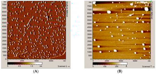 Compared with DLS (in suspension), the information of particle size of the dried liposomes and liposome/DNA complexes achieved by AFM is not accurate, while they could give intuitively insight into the morphology of liposomes and lipoplexes. Although AFM is not the best method to demonstrate the morphology of the liposomes and lipoplexes compared with transmission electron microscopy (TEM) [47], liposome Malt-DiC14MA and corresponding lipoplexes at N/P ratio of 8:1 were characterized only by AFM. As shown in Figure 1, lipids Malt-DiC14MA were dispersed uniformity on the mica and the spherical particles were formed with a diameter of 100–200 nm (Figure 1A). After the lipoplexes were formed at an N/P ratio of 8:1, the morphology of the lipoplexes was irregular, with spherical nanoparticle diameters of approximately 100–350 nm (Figure 1B). Furthermore, the particle size of the complex was slightly larger than naked liposomes.