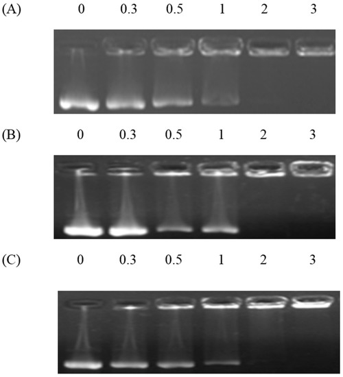 The interaction of cationic glycolipids and pDNA were determined by gel retardation assay. Five ratios of liposomes/pDNA complex (lipoplexes, 0.3:1, 0.5:1, 1:1, 2:1, 3:1) were prepared as described in Section 3.2. Naked pDNA was used as a control. After 30 min of incubation, the lipoplexes were electrophoresed (DYY-6C, Beijing Liuyi Biotechnology Co. Ltd., Beijing, China) on the 1% agarose gel containing ethidium bromide (EB) in TBE buffer (89 mM Tris, 89 mM boric acid, 2 mM EDTA (Ethylenediaminetetraacetic acid), pH = 8.3) at 110 V for 30 min, and then DNA was visualized under an ultraviolet (UV) illuminator (Tanon 2500, Shanghai Tianneng Science and Technology Co. Ltd., Shanghai, China).