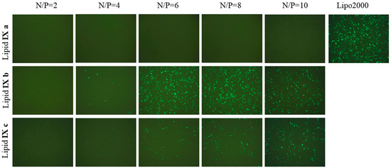 Fluorescence microscope images of HEK293 cells transfected by glycolipid/DNA complexes under different N/P ratios of 2:1, 4:1, 6:1, 8:1. 10:1.
