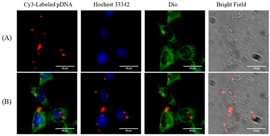 Fluorescence microscopic images (100×) of cellular uptake of Malt-DiC14MA Lipids/DNA complexes at the N/P ratio of 8:1 in HEK293 after 4 h of gene transfection. The upper column (A) represents single fluorescent images, the down column (B) represents merger images. Bar: 20 μm. (Green: Dio label cytomembrane, Red: Cy3-labeled pDNA, Blue: Hochest 33342 stained cell nuclei).