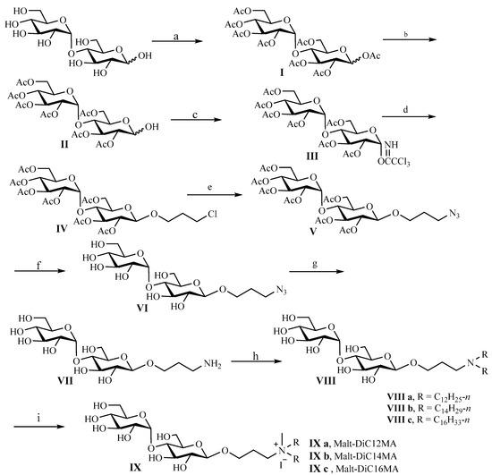 Synthesis of maltose-based cationic liposomes IX a–c. Reagents and conditions: (a) Ac2O, HClO4; (b) piperazine, THF (Tetrahydrofuran); (c) NCCCl3, K2CO3, CH2Cl2; (d) 3-chloro-1-propanol, TMSOTf (trimethylsilyl trifluoromethanesulfonate), CH2Cl2, −20 °C to RT; (e) NaN3, DMF (N,N-Dimethylformamide), 80 °C; (f) NH3/CH3OH; (g) Ph3P, THF, 75 °C, reflux; (h) K2CO3, alkyl bromide, C2H5OH, CH3OH, 70 °C; (i) CH3I, THF. Lipids IX a–IX d were labeled as Malt-DiC12MA, Malt-DiC14MA, Malt-DiC16MA, respectively.
