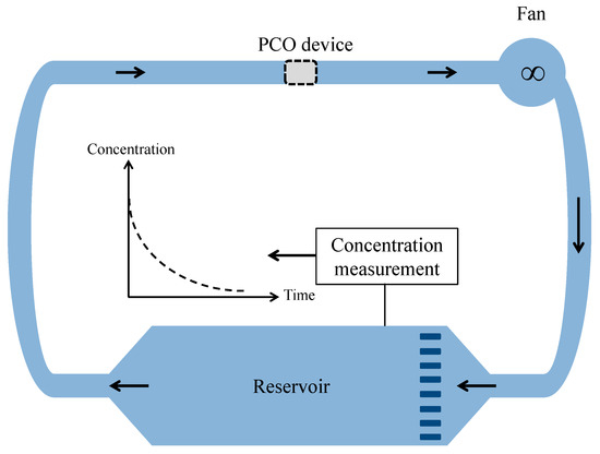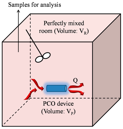 In the present work, the approach using a batch closed-loop reactor operating in recirculation mode is investigated to determine theoretically the performances of any PCO device. In this reactor, the PCO apparatus is inserted into a gas-tight chamber with a well-known volume (Figure 1). An amount of pollutant (or a mixture of pollutants) is injected into the chamber to obtain polluted air at the desired concentration. A centrifugal fan provides a controlled flow of the air through the PCO device. Once the initial pollutant concentration at steady-state is reached, the experiment is initiated by illuminating the light source. Samples of the air in the chamber are periodically analyzed with appropriate apparatus to monitor the decrease in the pollutant concentration over time. Then, the experimental data can be analyzed according to an appropriate mathematical model. However, even if different models for PCO devices are available in the literature [17] to fit the experimental data (exponential, linear, and polynomial fits [10]), some can generate bias in the performance determination. Therefore, the aim of the present study is to show that a laboratory closed-loop reactor operating in recirculation mode can be adequately modeled to determine the performances of photocatalytic devices for critical comparison. The rigorous mathematical model describing the decrease in the pollutant concentration over time is simplified by using realistic assumptions, enabling a convenient analysis of the experimental data. The limits of the model are given in terms of operating conditions (experiment duration, ratio of residence times, and flow rate ranges). Moreover, the model highlights that a laboratory closed-loop reactor can be an efficient technique for the determination of the CADR of PCO devices, which is of practical significance in the assessment of the effectiveness of systems for air purification.