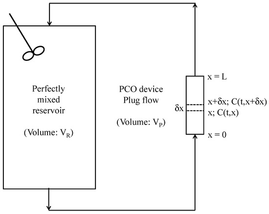 As Equation (2) cannot be easily used, Walker and Wragg [18] suggested an alternative approximate model based on the assumption that it is possible to neglect the ∂C/∂t term in Equation (1). This simplification is valid only if the volume of the PCO device is small in relation to the volume of the reservoir (i.e., if the ratio of the residence times (τP/τR) tends to 0). In this case, the concentration change with time at any plane x may be regarded as insignificant in comparison with the change in concentration with distance x. Thus, for the closed-loop reactor depicted in Figure 2, the concentration-time relationship is: