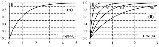 Overall efficiency of the batch recirculation closed-loop reactor system according to Equation (11). (A) Dimensionless form (time constant tc = τR/α); (B) Example of the dimensional form according to the cycle number 1/α (τR = 17.5 s).