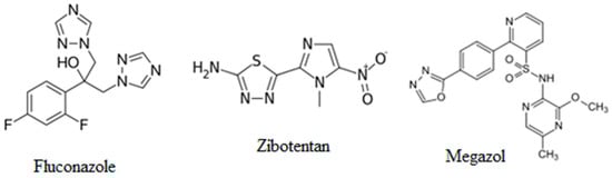 Heterocyclic compounds are well-known for their pharmaceutical importance, and the research for simple and efficient methods of synthesis of compounds incorporating heterocyclic rings has brought a new dimension to drug development [1]. In past decades heterocyclic scaffolds such as the 1,2,4-triazole, 1,3,4-oxadiazole and 1,3,4-thiadiazole rings and their derivatives were intensively investigated by researchers because of their biological activity. Among many heterocyclic compounds, these five-membered structures display unique spatial arrangements, which give possibilities to develop the synthetic pathways for microbiologically active compounds that can have potential therapeutic applications as new medicines. Currently, there are a lot of pharmaceutical products available on the market, which contain the previously mentioned structures such as fluconazole, efinaconazole, terconazole and fosfluconazole. These are used as antifungal agents and their structures are based on the 1,2,4-triazole core. The 1,3,4-thiadiazole scaffold can be found in other active substances like acetazolamide, methazolamide and megazol. Finally, the 1,3,4-oxadiazole arrangement is present in raltegravir and zibotentan. Exemplary structures of some of the previously listed medicines containing mentioned active scaffolds are presented in Figure 1 below.