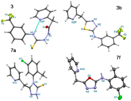 Perspective view of the molecular structures of the derivatives 2-(pyridin-2-yl-acetyl)-N-[3-(trifluoromethyl)phenyl]hydrazinecarbothioamide (3), 5-(pyridin-2-yl-methyl)-N-[3-(trifluoromethyl)phenyl]-1,3,4-thiadiazol-2-amine (3b), 4-(5-chloro-2-methylphenyl)-5-(pyridin-2-yl-methyl)-2,4-dihydro-3H-1,2,4-triazole-3-thione (7a) and N-(2-chloro-5-methylphenyl)-5-(pyridin-2-ylmethyl)-1,3,4-oxadiazol-2-amine (7f).