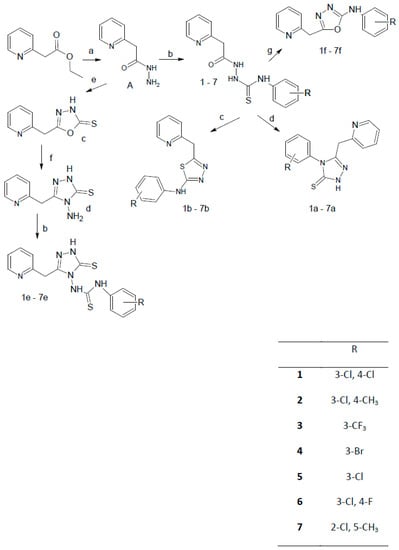 In first step the ester ethyl 2-(2-pyridylacetate) was transformed into 2-(pyridin-2-yl)acetohydrazide (A) [35,36]. This was a starting material to obtain the 2-pyridylacetate thiosemicarbazide and oxazole derivatives. Derivatives of N-(phenylsubstituted)-2-(pyridin-2-yl acetyl) hydrazinecarbothioamide (thiosemicarbazide derivatives) were prepared by reaction of hydrazide (A) with an appropriate aryl isothiocyanate. Briefly, 2-(pyridin-2-yl)-acetohydrazide (A) and different isothiocyanates were allowed to react in boiling acetonitrile for 6 h. N-(Phenylsubstituted)-2-(pyridin-2-yl-acetyl)hydrazinecarbothioamide derivatives 1–7 were the starting materials to obtain the corresponding 1,2,4-triazole, 1,3,4-thiadiazole and 1,3,4-oxadiazole derivatives 1a–7a, 1b–7b and 1f–7f, respectively.
