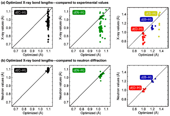 Bond lengths of the investigated structures. (a) X-ray determined values (vertical axis) plotted against quantum-chemically optimized ones (horizontal axis); (b) Quantum-chemically optimized values (horizontal axis) vs. the available neutron diffraction data. Covalent C–H (left), N–H (middle), O–H, S–H, and B–H (right) bond lengths are considered. Reprinted, with permission, from [24]. Copyright 2012, by The American Chemical Society.