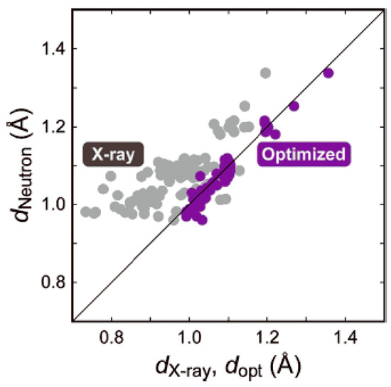 Figure 1a illustrates a plot of the X-ray structural data (vertical axis) vs. the quantum chemically optimized values (horizontal axis) for C–H, N–H, O–H, B–H, and S–H bonds [19]. In all cases a wide range of values was observed in the X-ray structures. On the contrary, after quantum chemical optimization of the X-ray structures, a very good agreement with the neutron diffraction data was observed (Figure 1b). The S–H data were omitted from the correlation due to ambiguities in the S–H bond lengths of the neutron diffraction experiments. Figure 2 illustrates the neutron diffraction data of all the X–H bond lengths vs. the X-ray structural data (light gray circles) and those obtained after quantum chemical optimization (purple circles). Again the quantum chemically optimized structures were in very good agreement with those obtained from neutron diffraction experiments [24]. It should be emphasized, however, that DFT calculations typically do not include temperature effects, therefore, they represent the molecular system at absolute zero. Since X-ray diffraction experiments are usually performed between room temperature and cryogenic temperatures, the experimental unit cell volumes and atomic positions may differ from those resulting from DFT calculations.