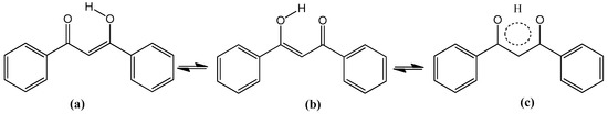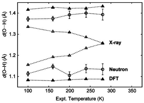 The case of dibenzoylmethane is of particular interest due to keto-enol tautomeric equilibrium which is characterized with a strong intramolecular hydrogen bond interaction. The shape of the low barrier O–H···O potential function either a double minimum potential corresponding to two tautomeric forms (a) and (b), or a single minimum symmetrical one in a strongly delocalized system (c) (Scheme 1), has been the subject of extensive studies [58,59,60]. The O–H and O···H distances, measured by neutron diffraction [61], were found to be unchanged over the temperature range of 100 to 280 K (Figure 3). The X-ray diffraction demonstrates that the O–H and O···H distances become indistinguishable at 200 K corresponding to the delocalized system (c) [61]. DFT calculations by Deringer et al. [24] demonstrated an agreement with the neutron diffraction data, however, detailed structural data were not provided.