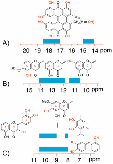Classification of the chemical shifts of the –OH groups in DMSO-d6 on the basis of the structure of the molecule and the nature of the substituent in the rings. (A–C) are the regions of 14–20 ppm, 10–15 ppm, and 8–10.5 ppm, respectively. Reprinted, with permission, from [67]. Copyright 2014, by MDPI.